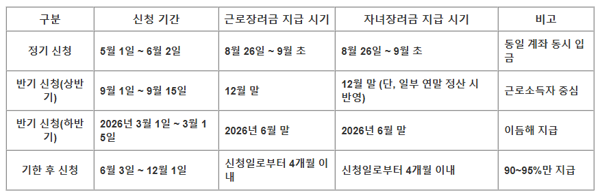 - 정기 신청: 8월 26일부터 근로·자녀장려금 모두 순차 입금 (9월 초 대부분 완료)