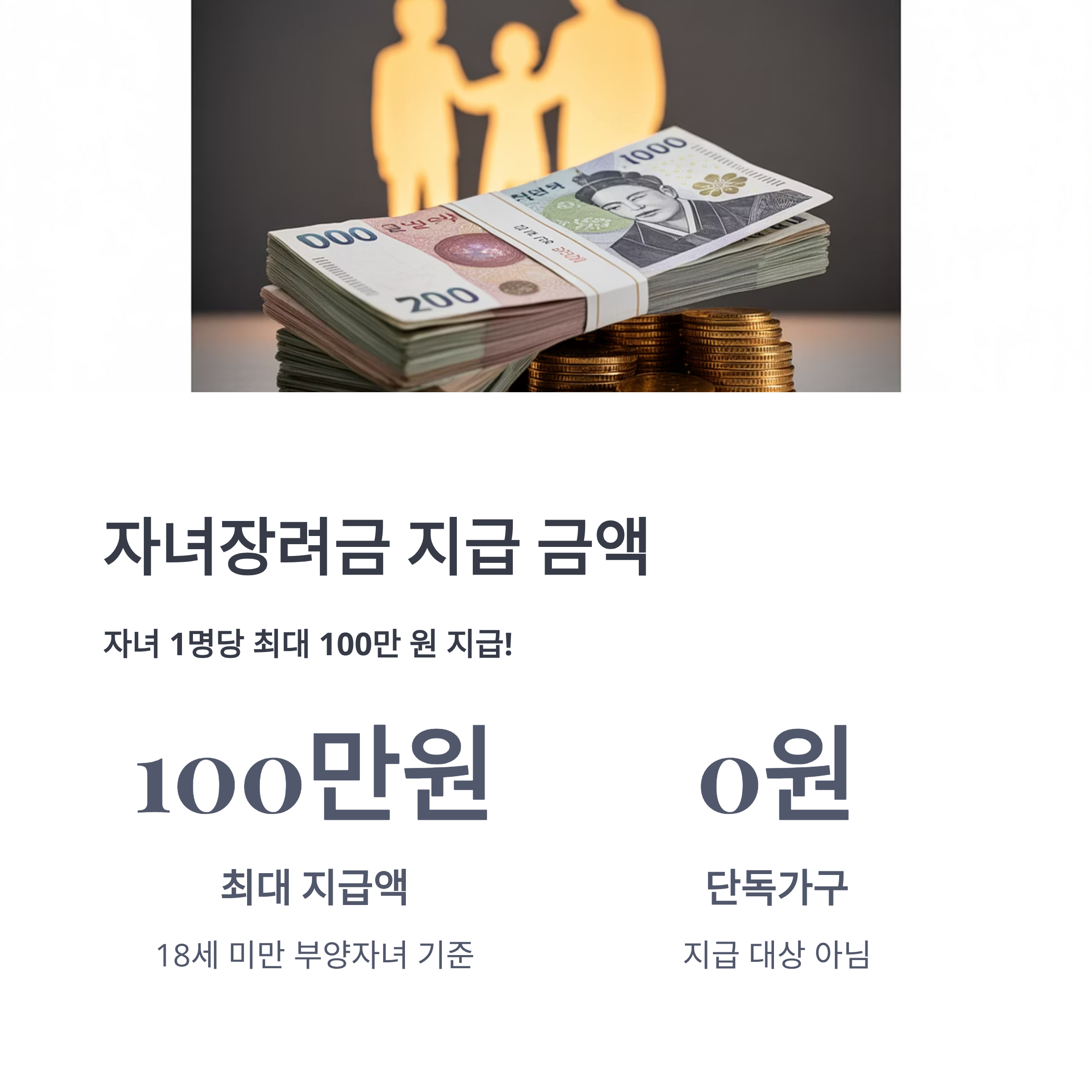 - 자녀장려금: 자녀 1인당 최대 100만 원 (18세 미만 부양 자녀)