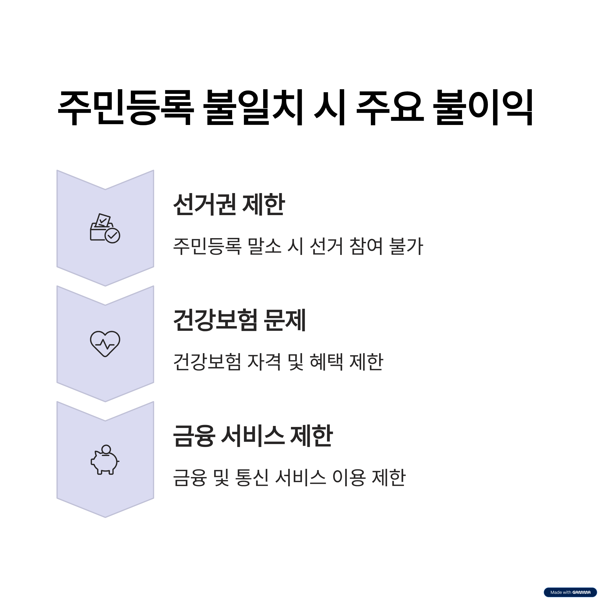 A. 투표권, 건강보험, 금융·통신 서비스 등에서 불이익이 발생할 수 있습니다.