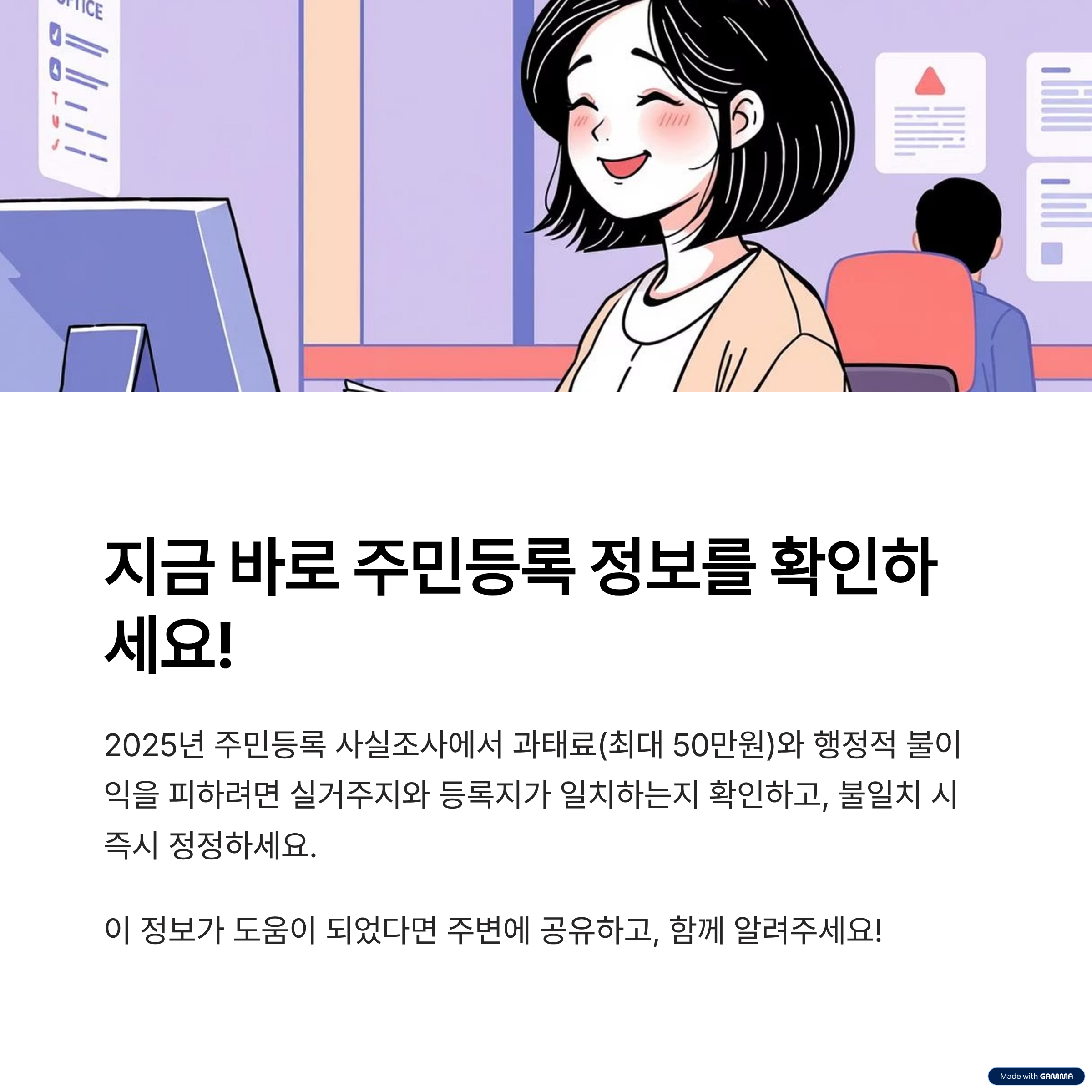 - 주소와 실제 거주지가 다를 경우, 즉시 신고 및 정정 권장