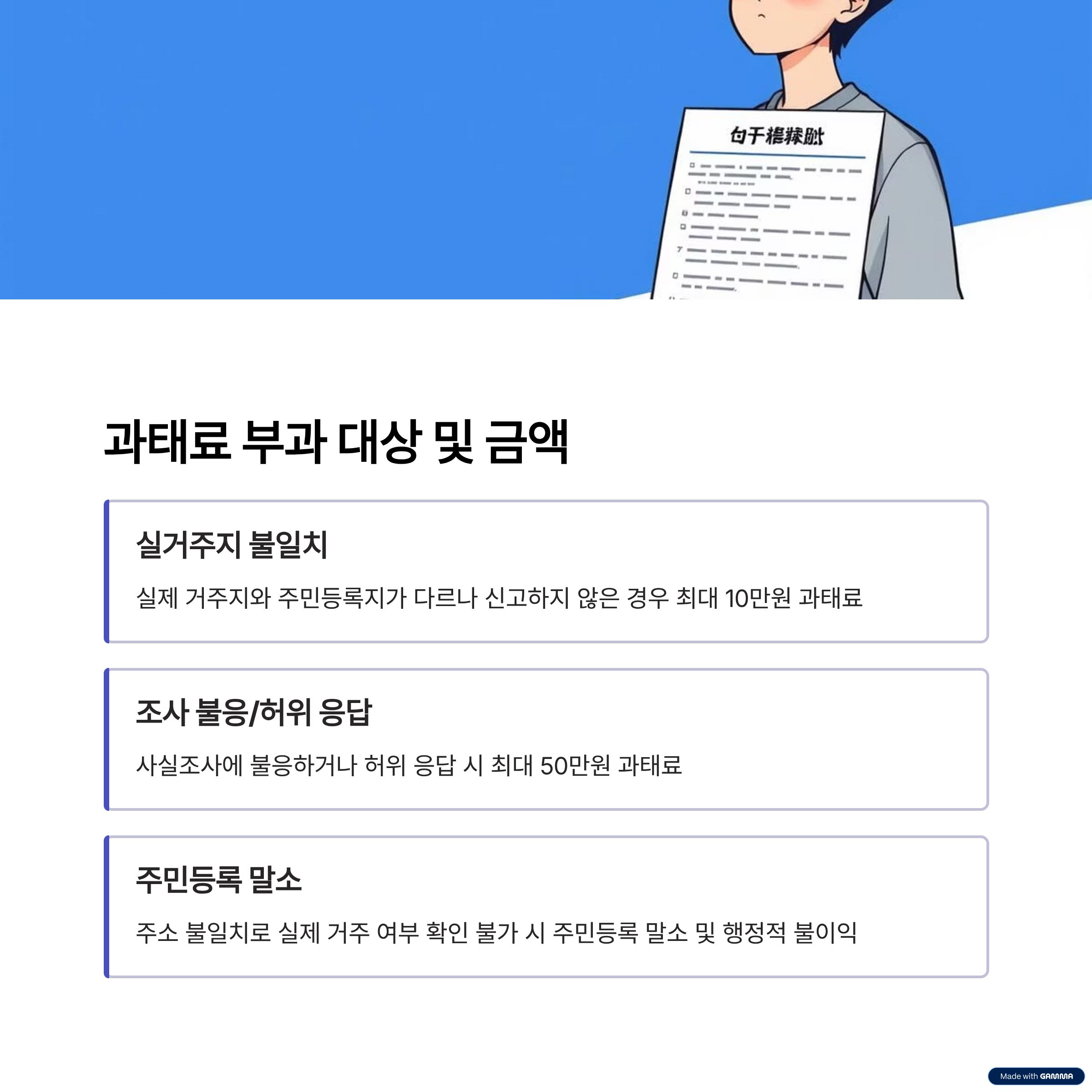 - 주민등록지와 실제 거주지가 다르나 신고하지 않거나 허위 신고한 경우 → 10만 원 이하 과태료