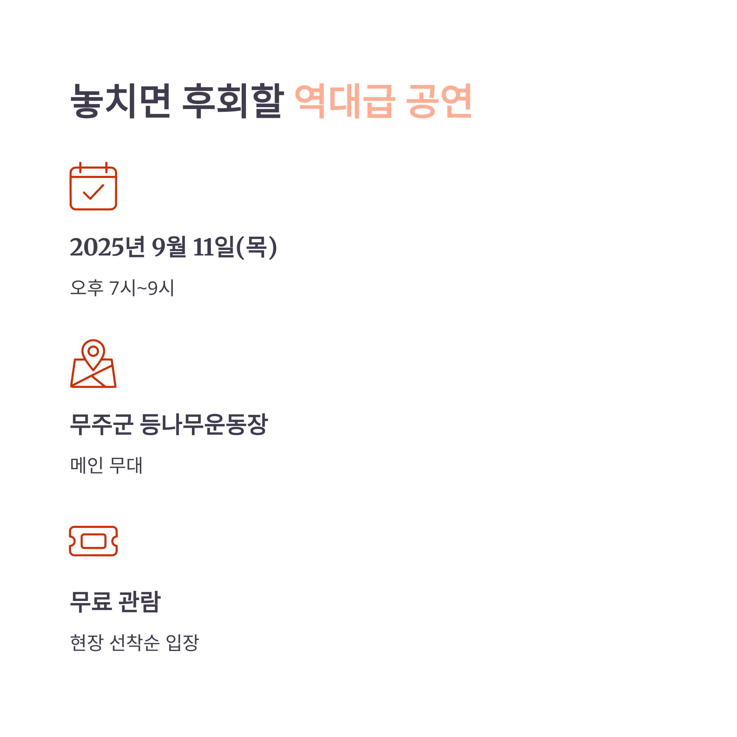 - 관람: 무료, 선착순 입장 (일부 좌석 현장 추첨제 운영)