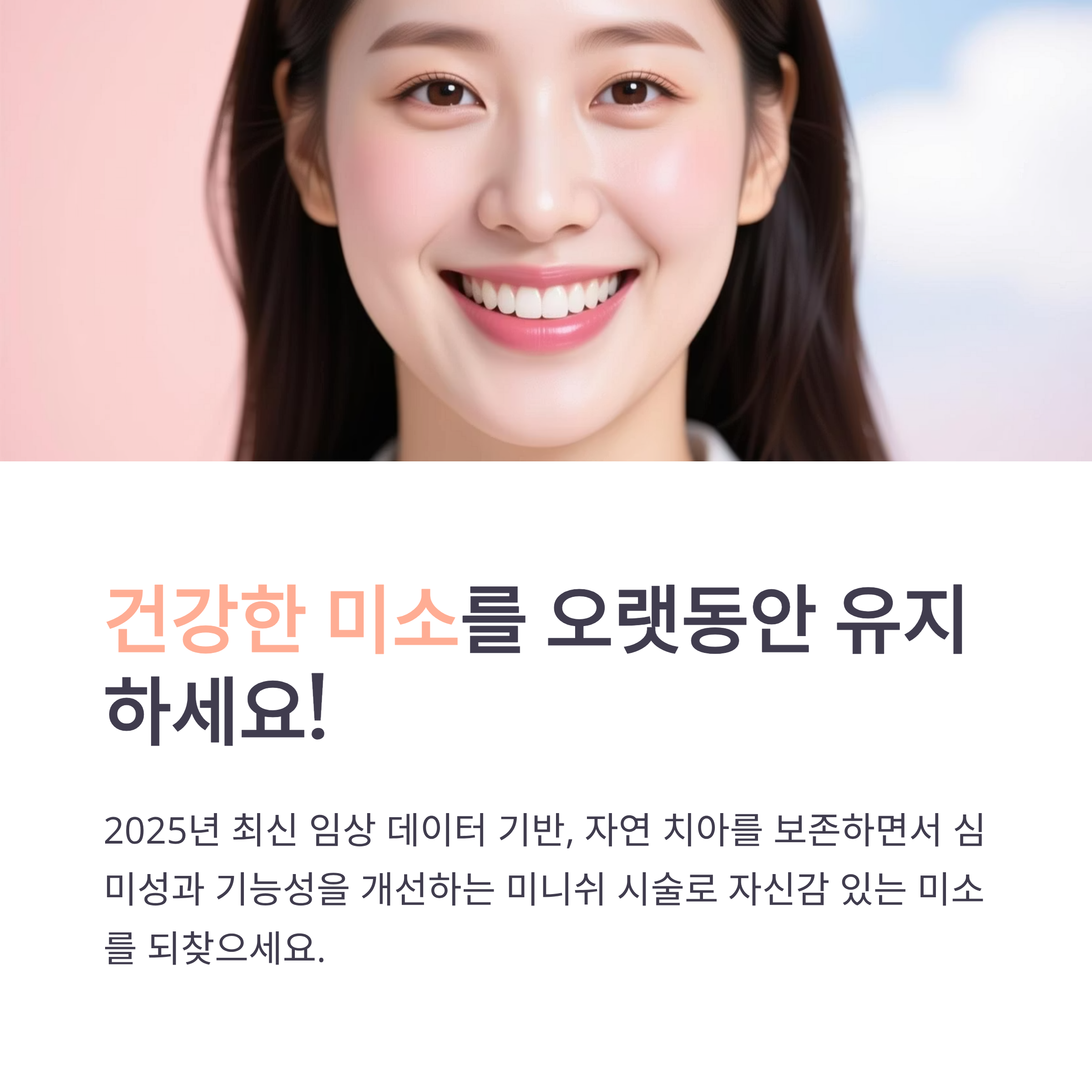 2025년 임상 데이터와 환자 만족도를 기반으로, 미니쉬는 자연 치아를 지키면서 심미성과 기능을 동시에 회복할 수 있는 안전하고 효과적인 치아 회복 솔루션입니다.