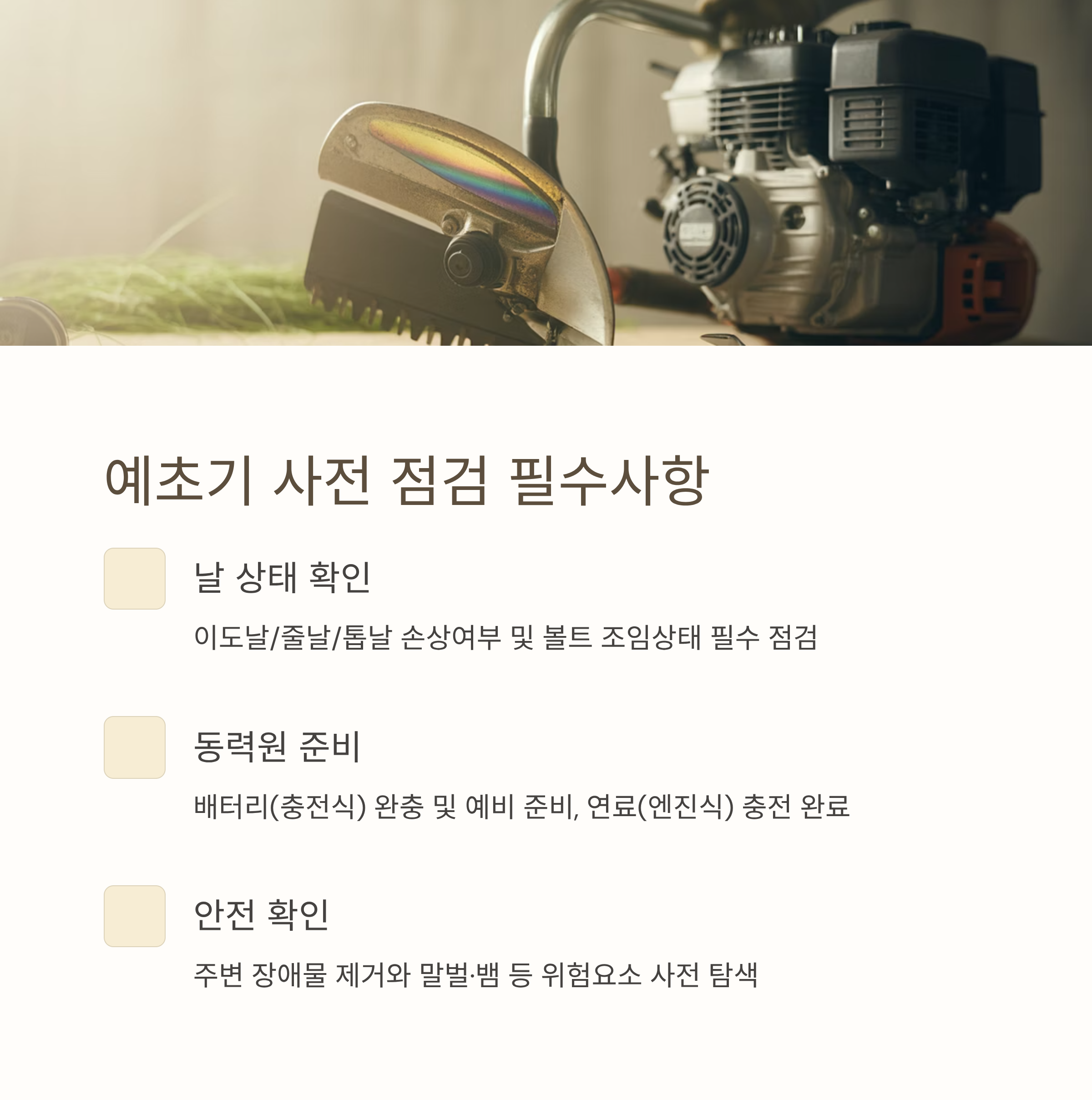 - 예초날 상태 확인: 손상·풀림 여부 점검 후 상황에 맞게 교체 (이도날·줄날·톱날 등)