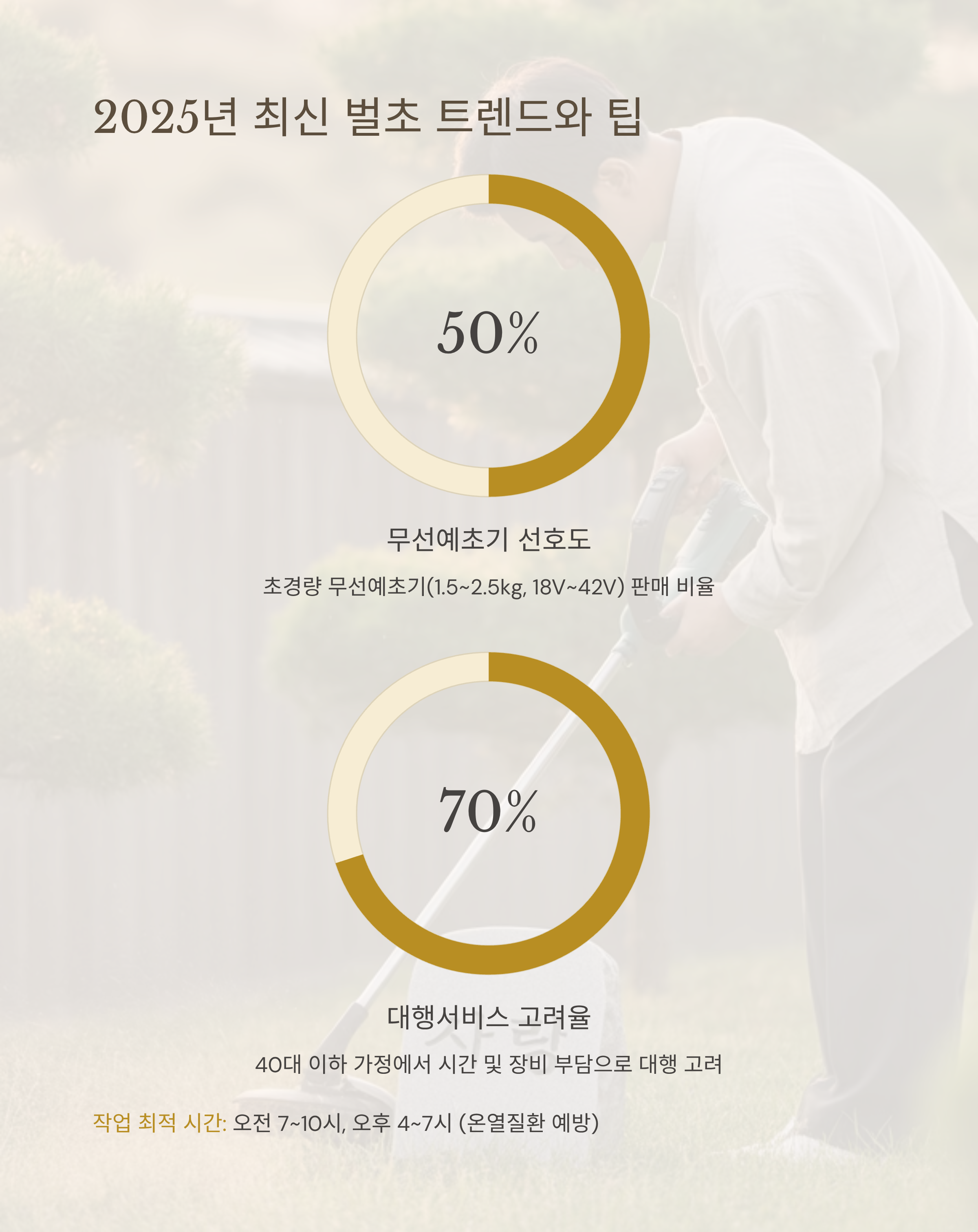 - 2025년 판매된 예초기의 50% 이상이 초경량 무선형(1.5~2.5kg, 18~42V), 초보자 인기 최고