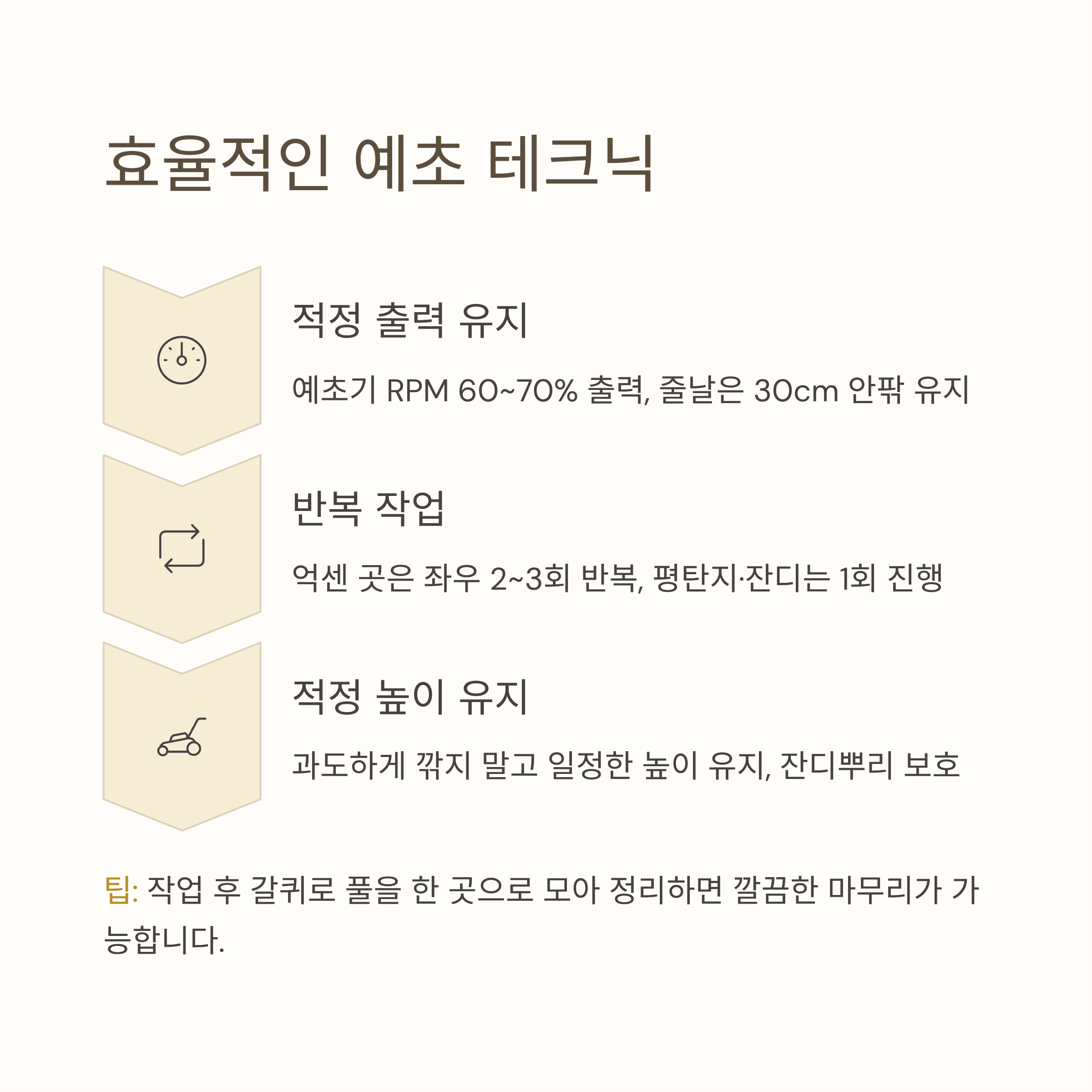 - 억센 풀은 2~3회 반복, 평탄지·잔디는 1회로 충분