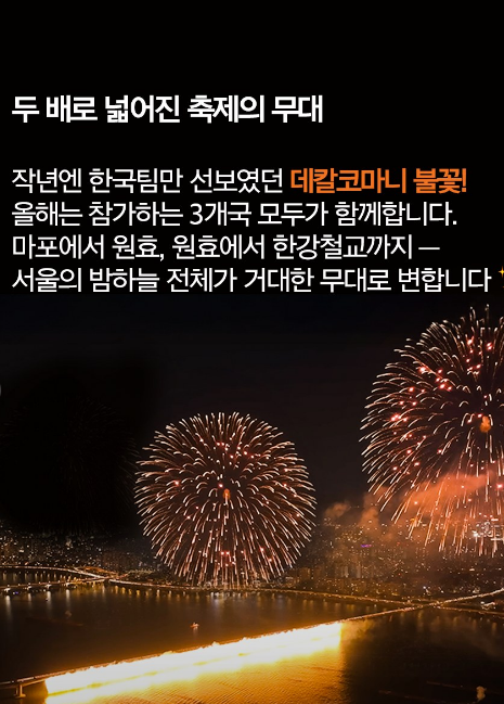 이번 가을, 서울 하늘을 수놓는 불꽃과 함께 가장 찬란한 순간을 남겨보세요.