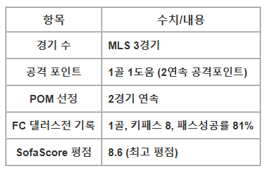 - 8월 24일 FC 댈러스전: 전반 6분 데뷔골 → POM 연속 선정