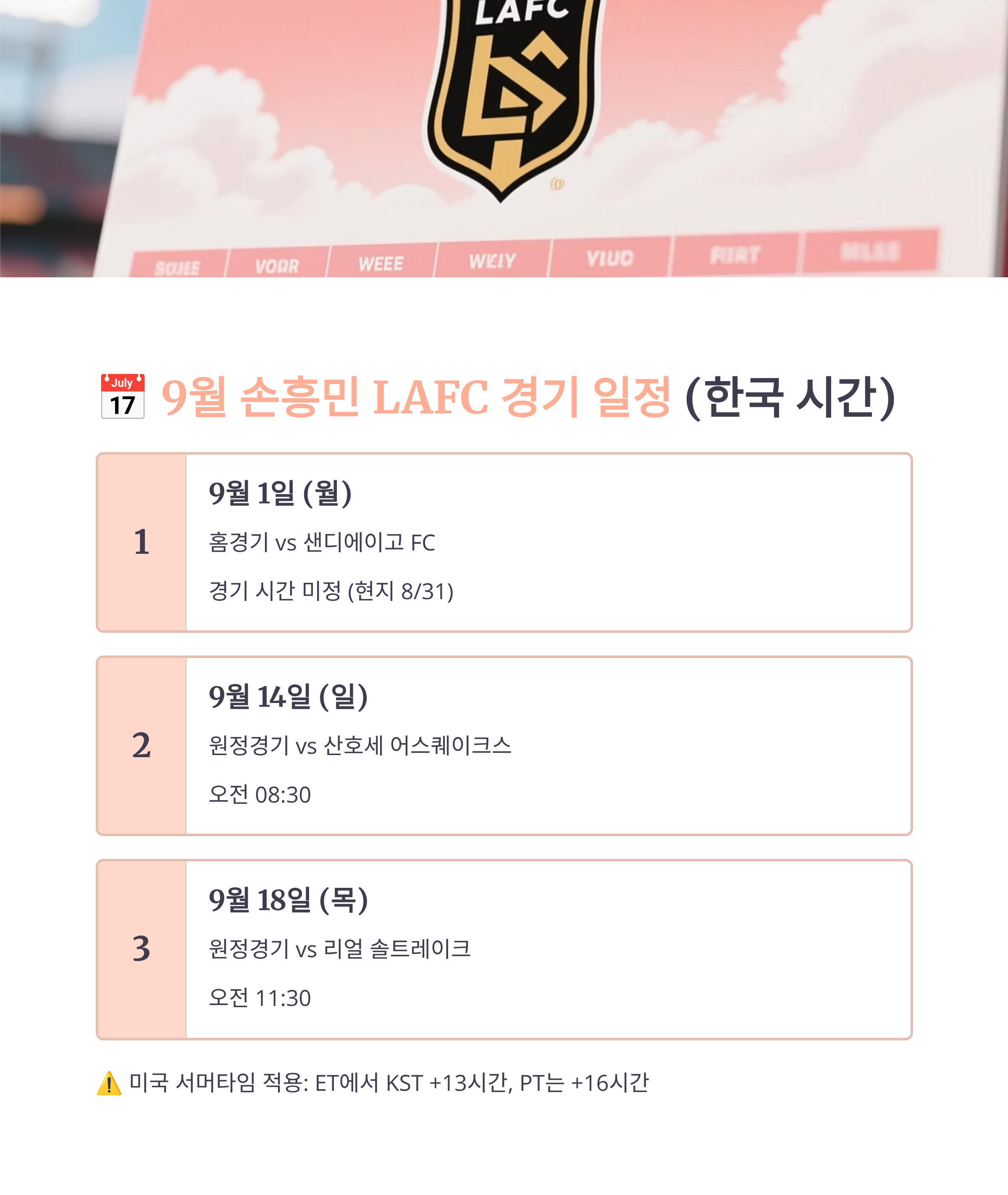 손흥민 선수의 LAFC 2025년 9월 경기 일정과 실시간 확인 및 알림 설정 방법을 정리했습니다.