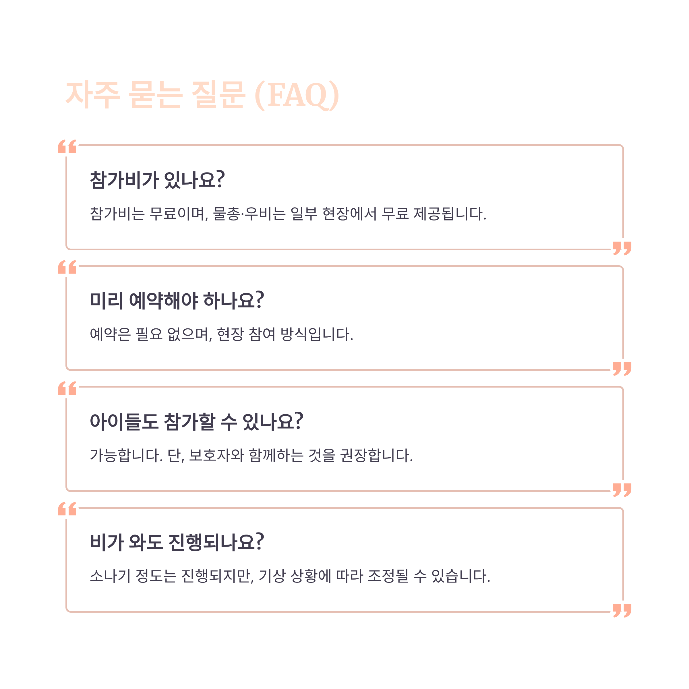 A1. 참가비는 무료이며, 물총·우비는 일부 현장에서 무료 제공됩니다.