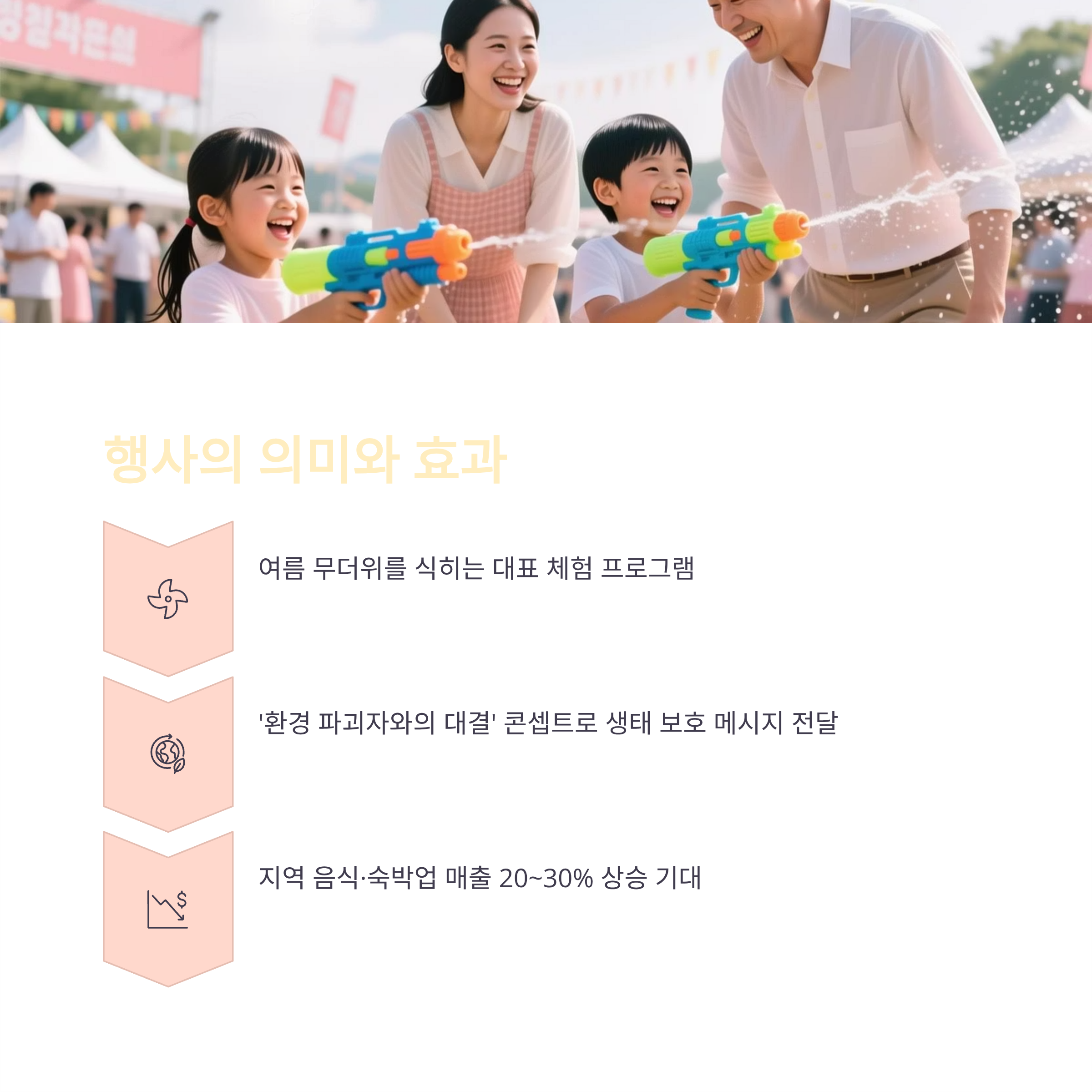 아이부터 어른까지 모두 즐길 수 있는 가족형 체험형 프로그램으로, 시원한 물총 싸움과 함께 환경 메시지도 전달합니다.
