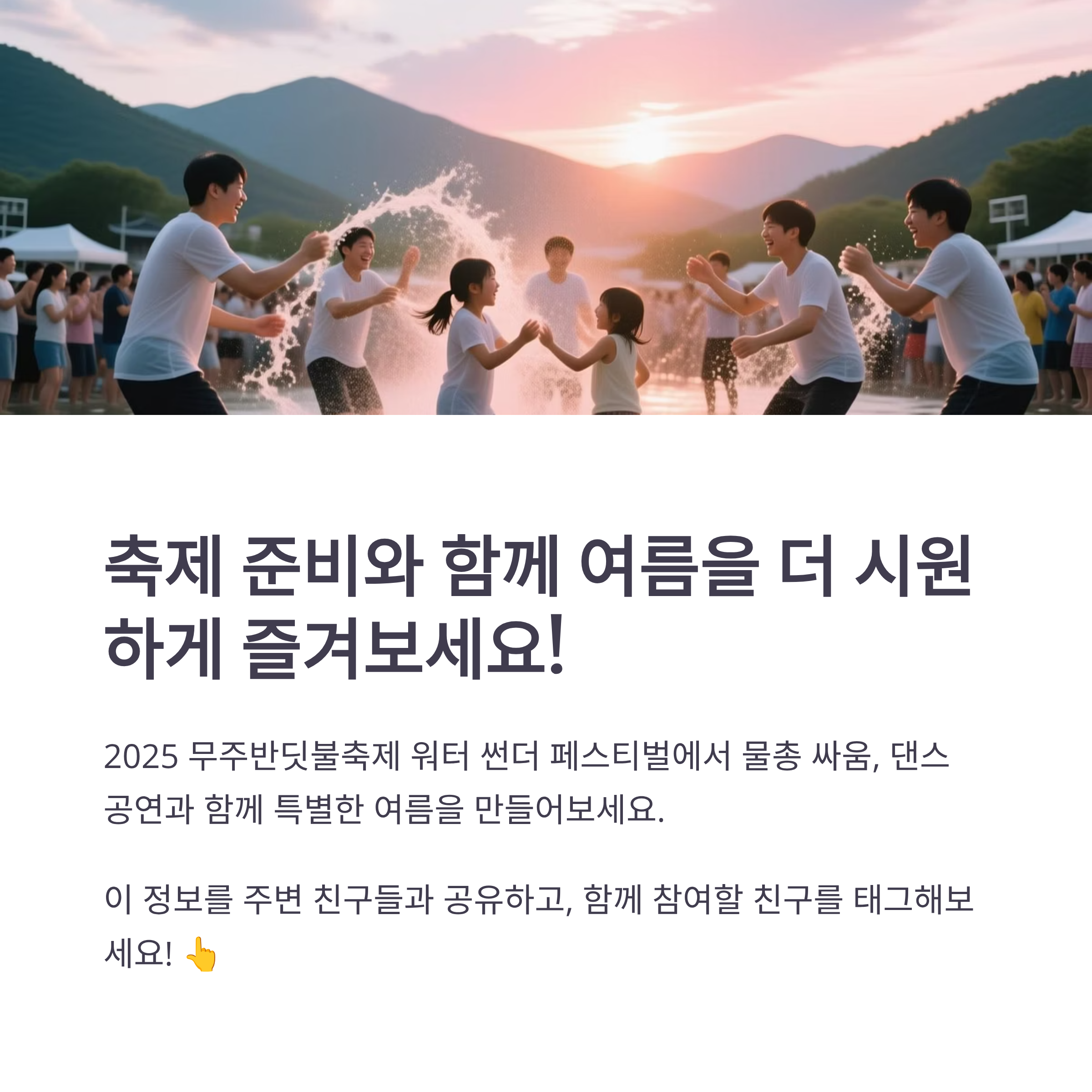 2025 무주반딧불축제 워터 썬더 페스티벌은 남녀노소 누구나 즐길 수 있는 시원한 여름 대표 프로그램입니다.