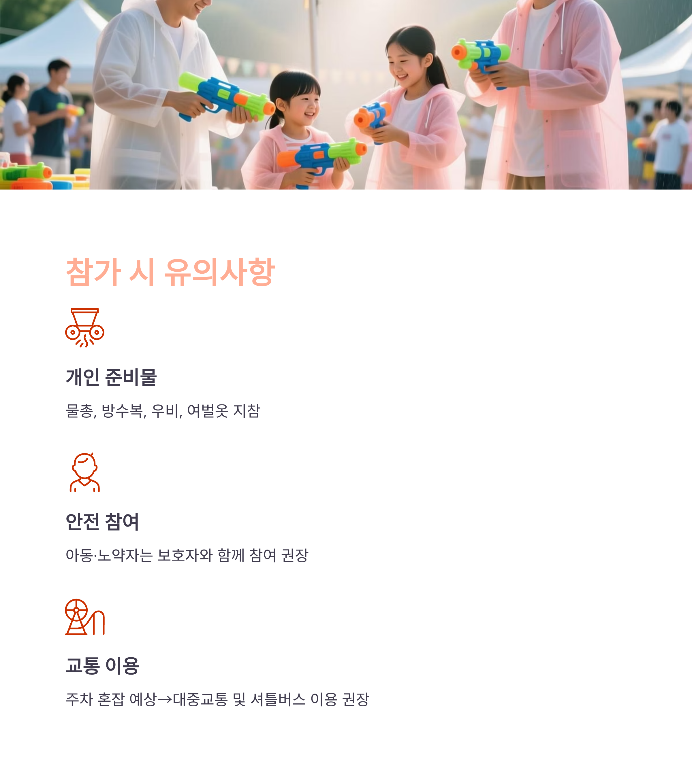 - 개인 준비물: 물총, 방수복, 우비, 여벌옷