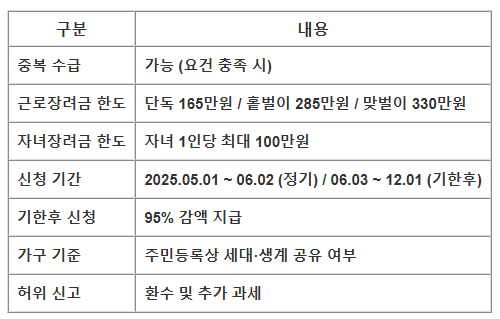 2025년 근로장려금과 자녀장려금은 서로 다른 목적과 기준을 가진 제도이지만, 같은 가구에서 소득·재산 요건을 충족하면 동시에 중복 수급이 가능합니다.