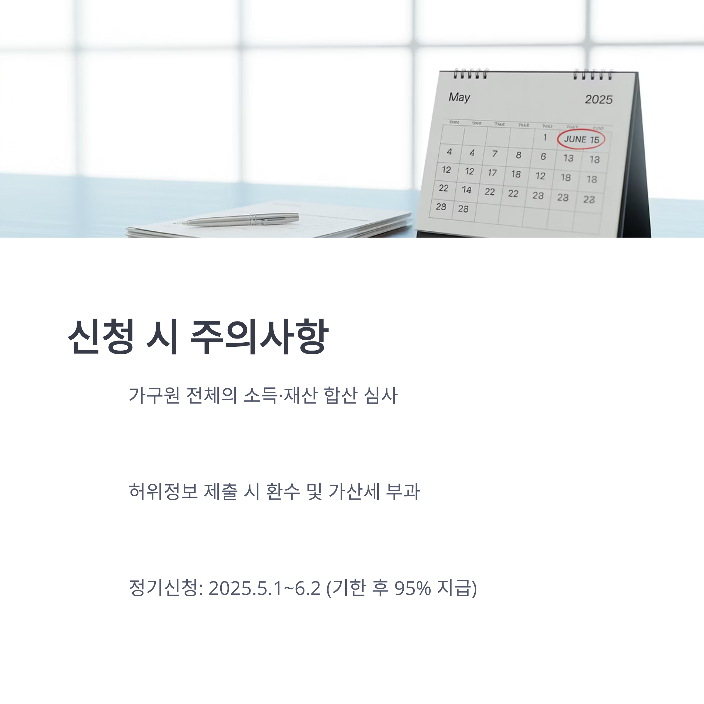 다만 반드시 신청 기간을 지키고, 정확한 소득·재산 자료를 제출해야 불이익을 피할 수 있습니다.
