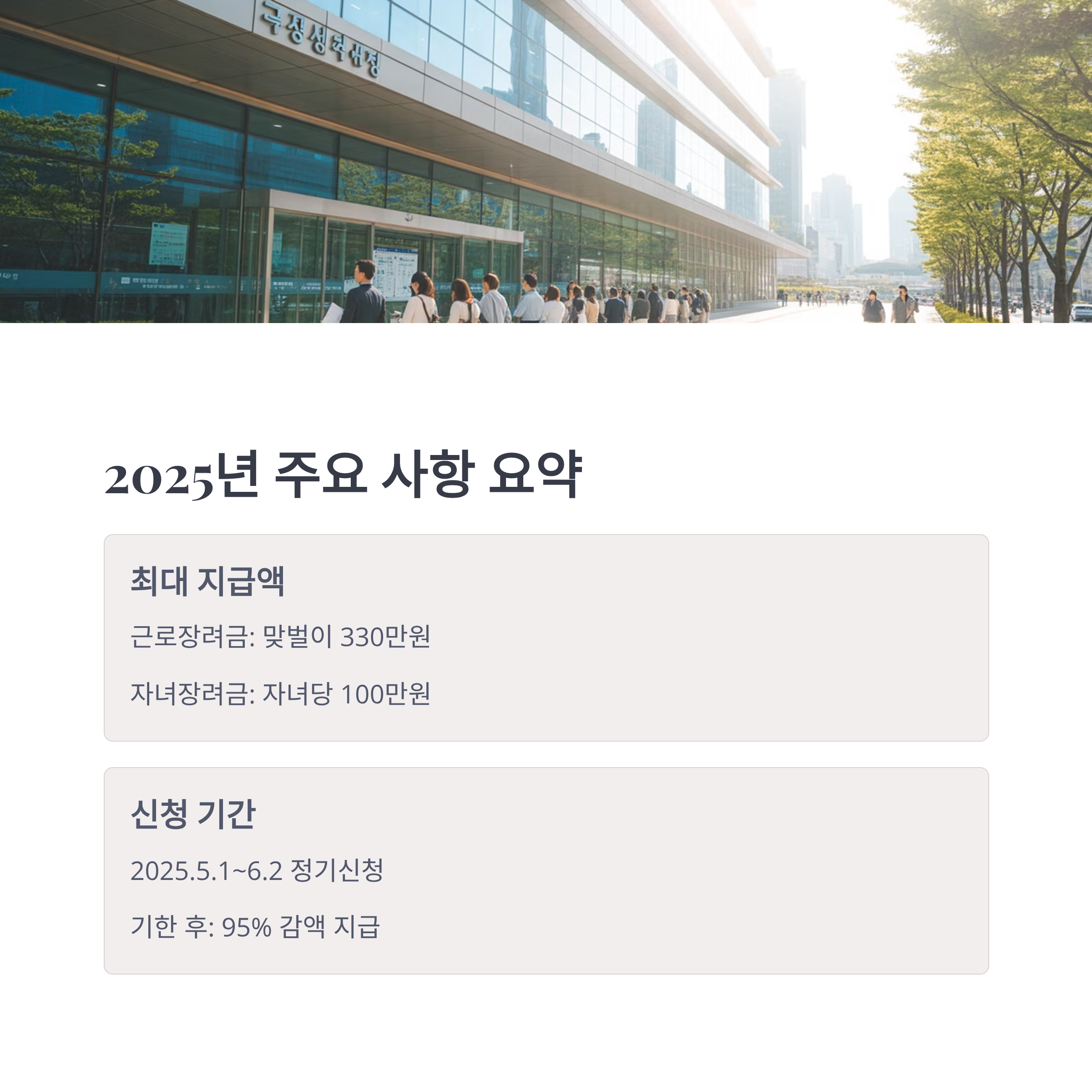 - 근로장려금: 단독가구 최대 165만원, 홑벌이가구 최대 285만원, 맞벌이가구 최대 330만원