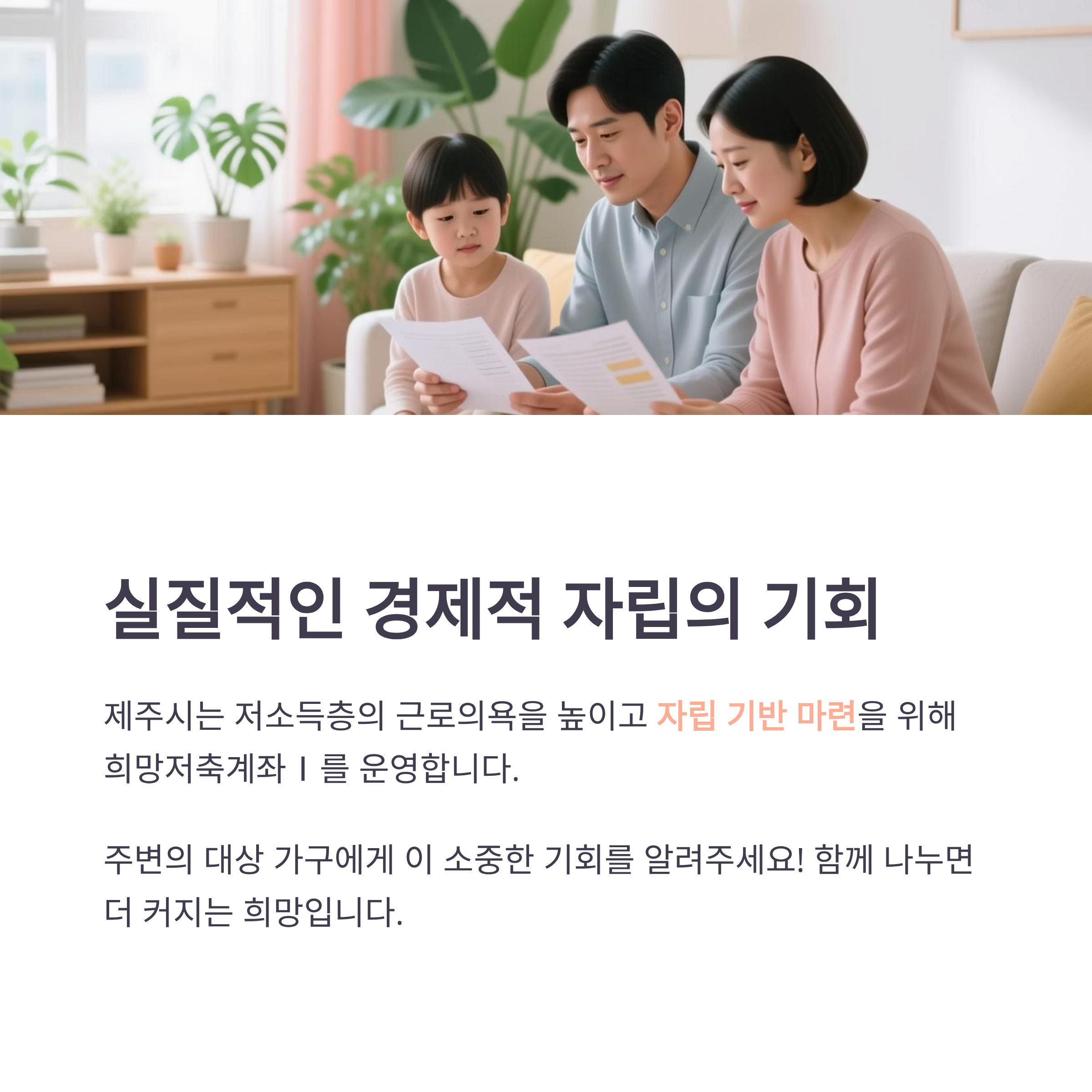 저소득 가구의 자립을 돕기 위해 제주시가 희망저축계좌Ⅰ 신규 모집을 실시합니다.