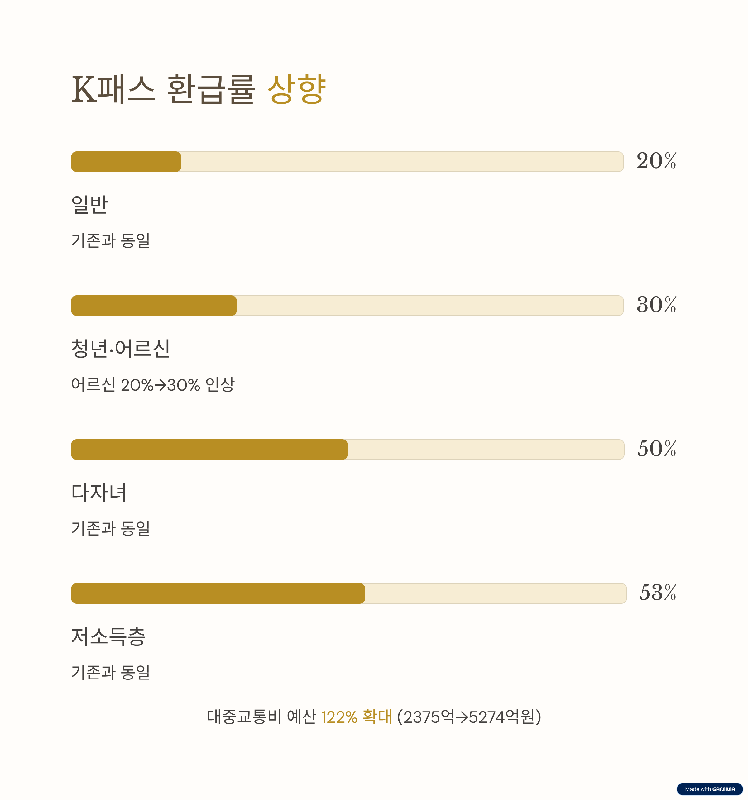 - 대중교통 환급사업 예산: 2,375억 원 → 5,274억 원(122% 확대)