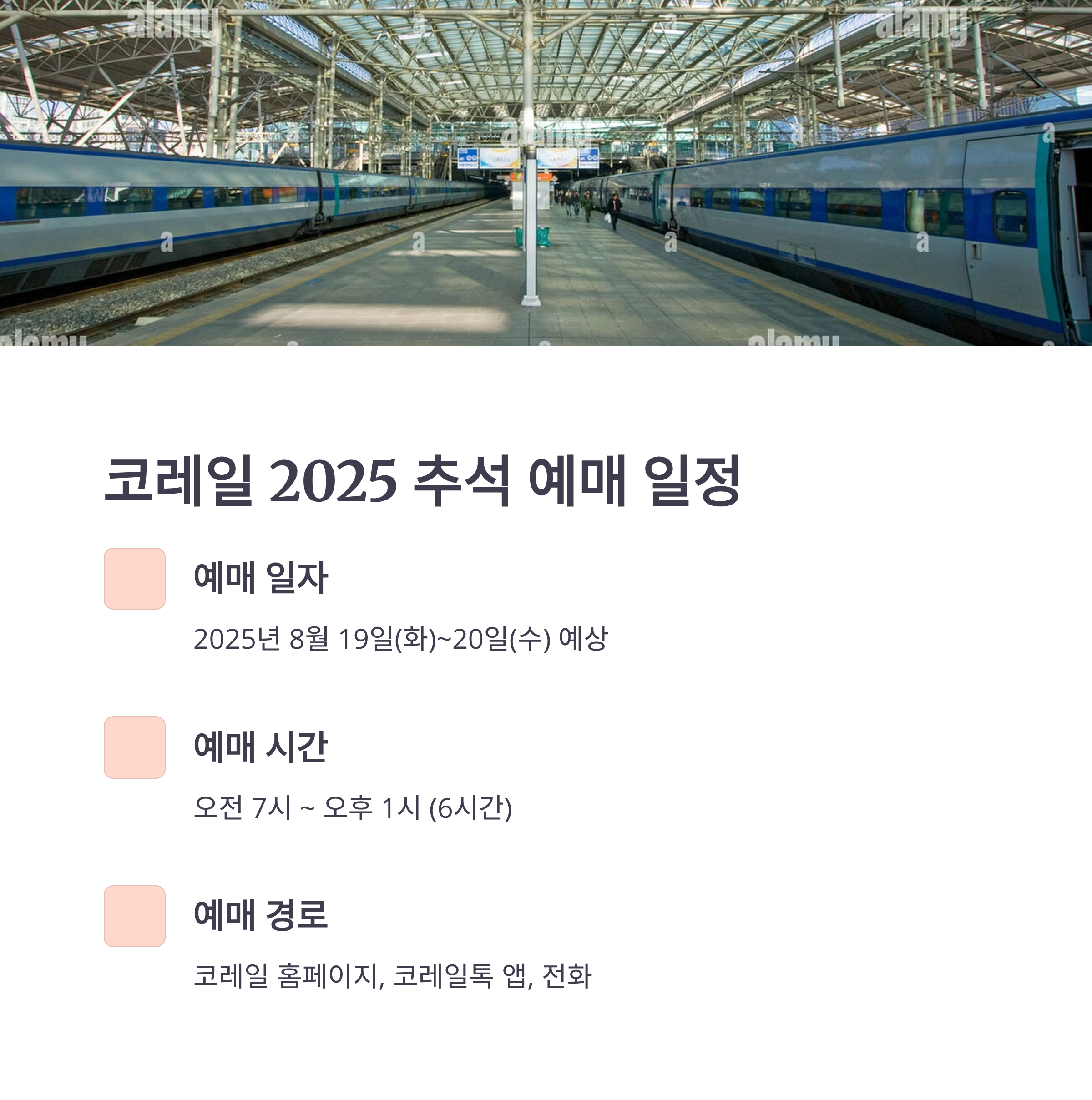 ※ 코레일은 해마다 8월 중순 예매를 진행하며, 공식 일정은 8월 중순 코레일 공지에서 확인 가능합니다.