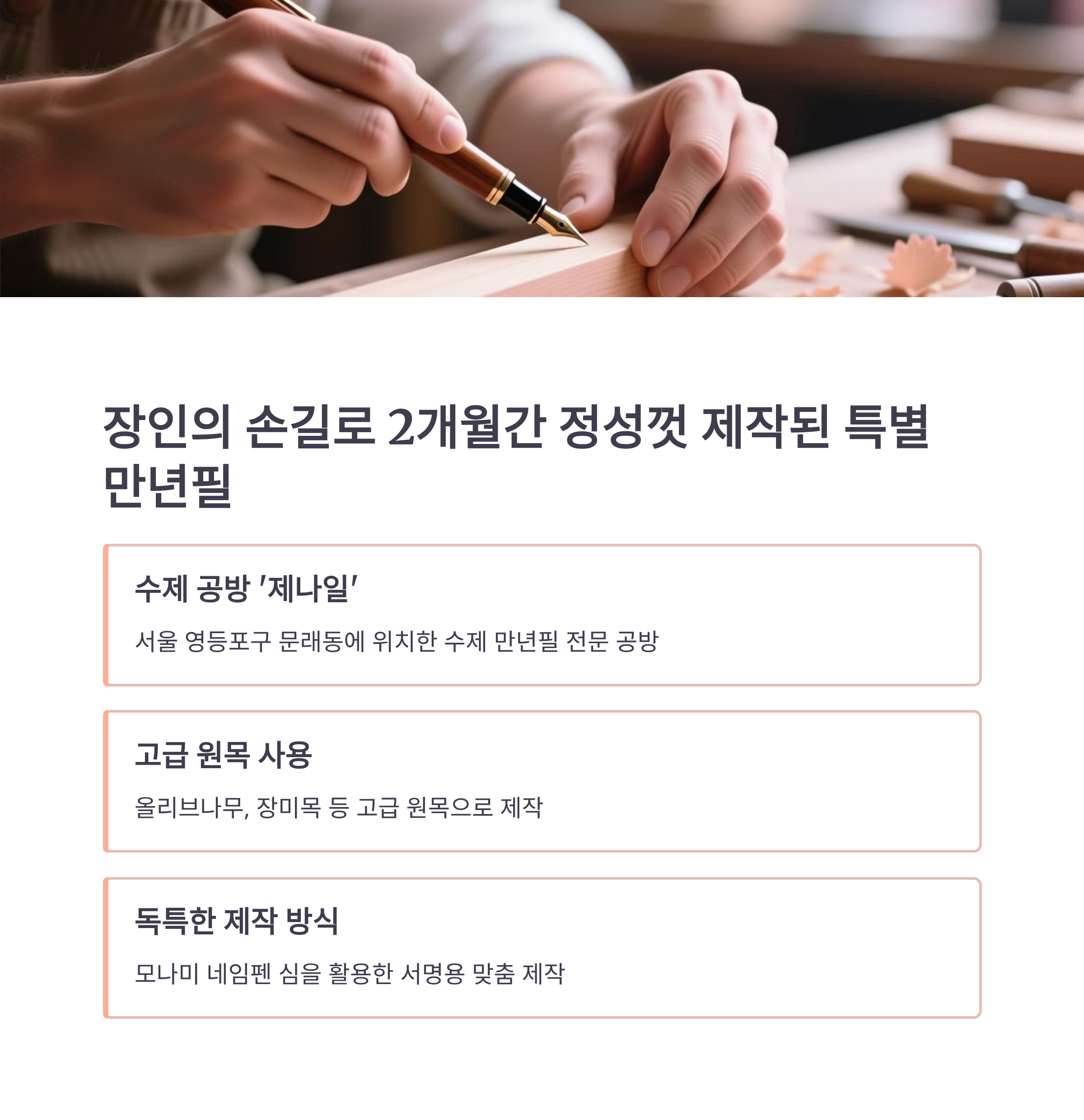 트럼프 전 대통령이 받은 이 만년필은 국내 수제 공방의 위상을 세계 무대에 알린 계기가 되었으며, 한국 수제 만년필 산업의 국제적 위상을 높이는 대표 사례로 평가되고 있습니다.