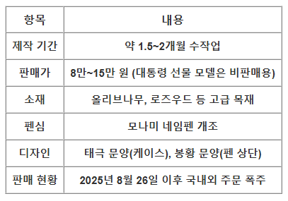 이번 만년필은 단순한 필기구가 아니라 한국 전통 소재와 장인의 기술이 담긴 외교 선물로, 국내외 관심을 집중시키고 있습니다.