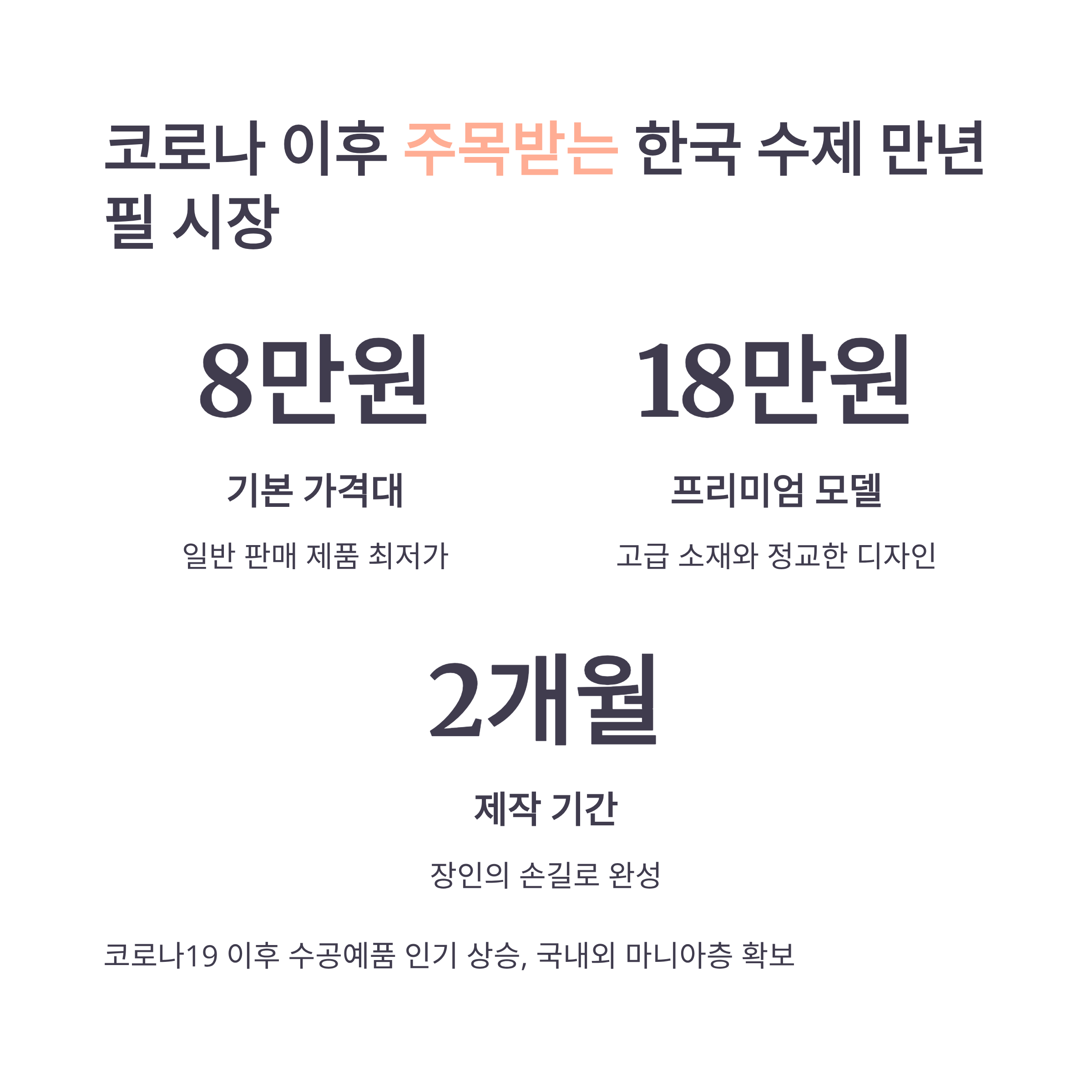 한국 전통 문양과 친환경 소재를 활용한 디자인은 해외 펜 마니아들 사이에서도 긍정적인 반응을 얻고 있으며, 특히 한정 수량·맞춤 제작 방식이 브랜드 가치를 높이고 있습니다.