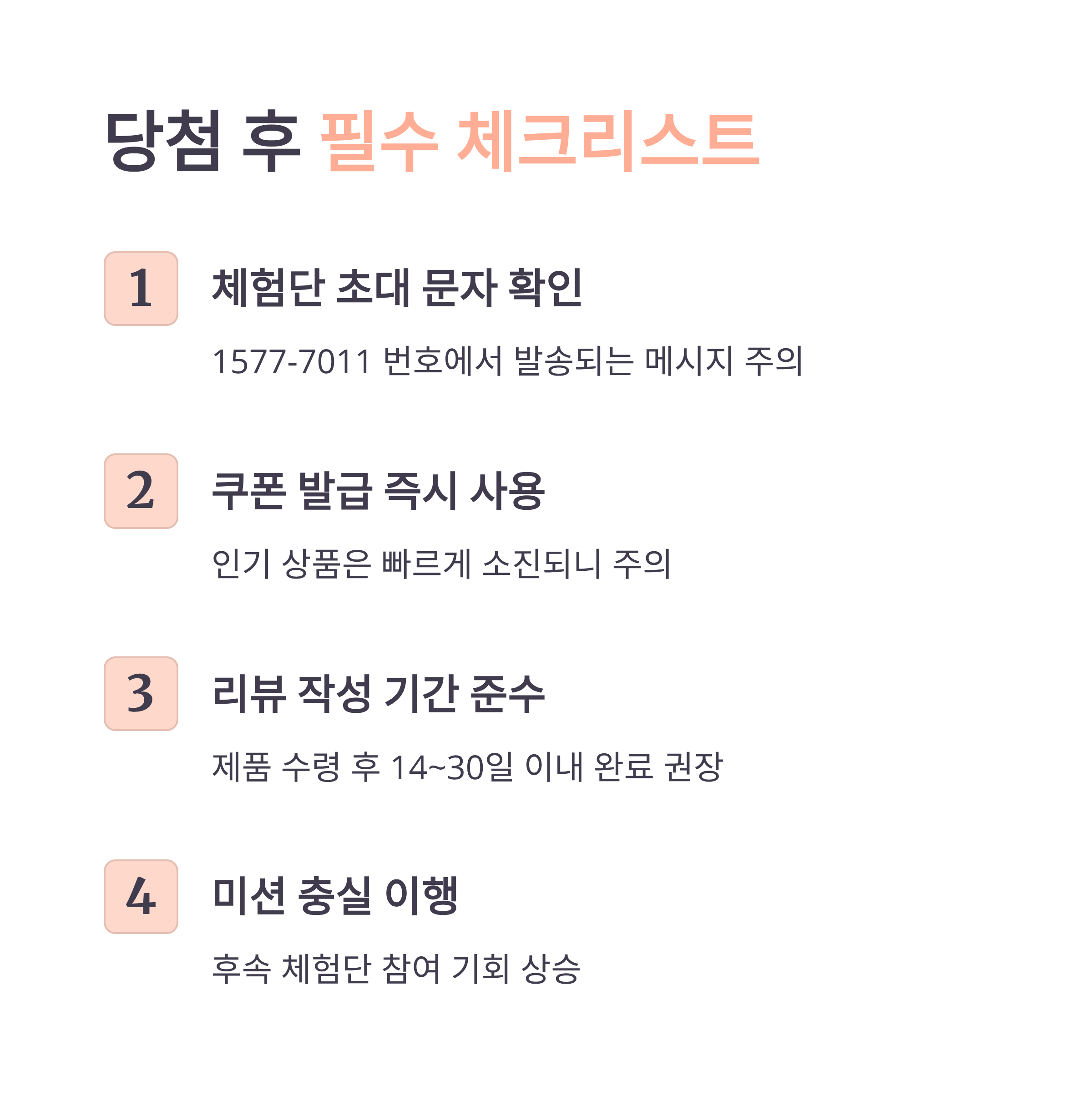 - 당첨 후 2~3일 내 체험단 쿠폰이 지급되며, 지정 기간 내 제품 구매 필수