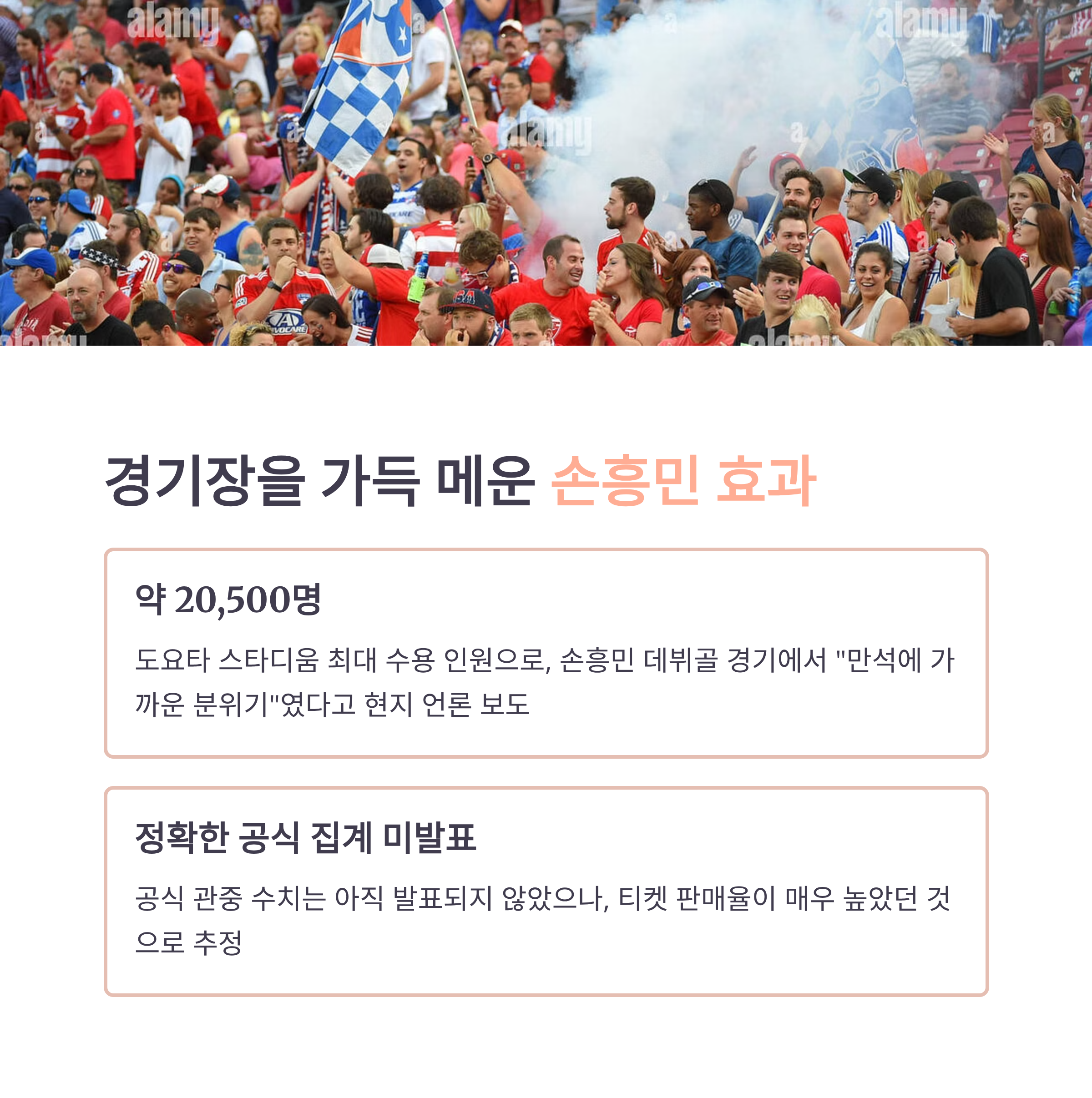 - 정확한 공식 발표는 없지만, 손흥민 데뷔골 경기였던 도요타 스타디움(FC 댈러스 홈)은 2만 500석 규모 전석 매진에 가까웠다는 지역 보도가 있었습니다.