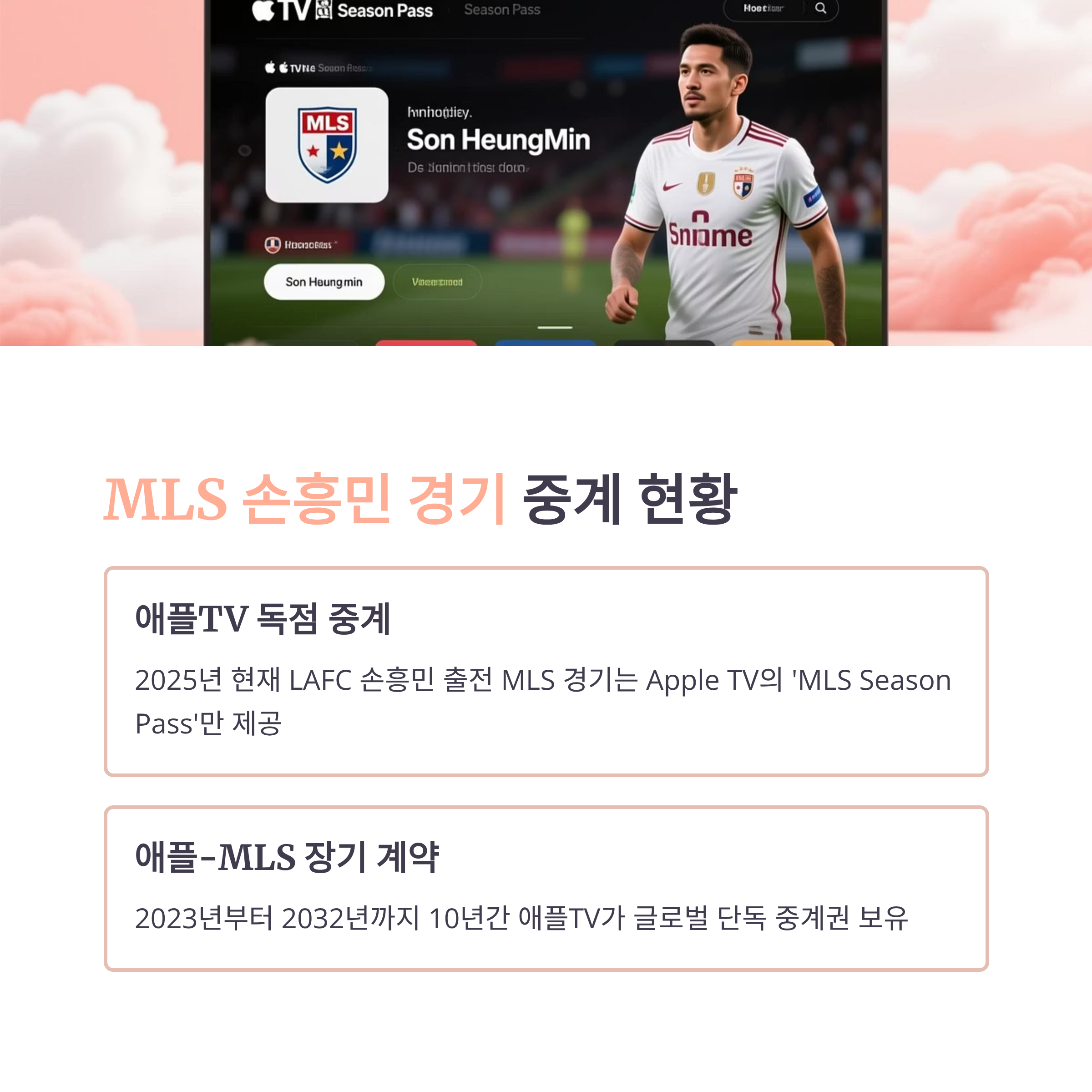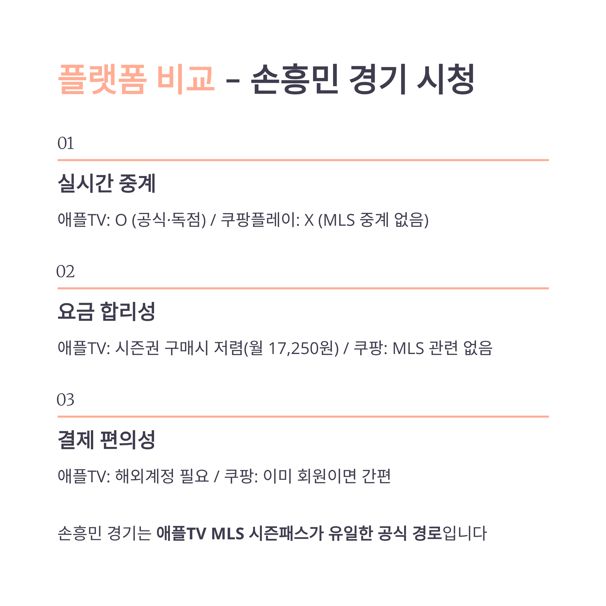 - 2025년 기준, 손흥민이 뛰는 모든 MLS 경기 공식 실시간 중계는 Apple TV 'MLS Season Pass'에서만 시청할 수 있습니다.